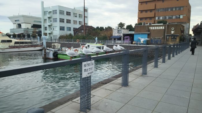 欄干には、カモメが鈴なり。カメラを向けると飛んで行ってしまいました。