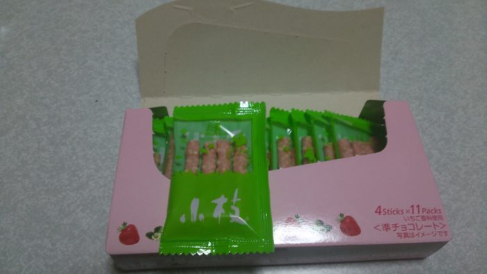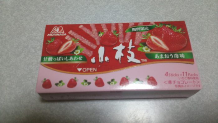 今日は、「小枝あまおう苺味」を食べてみました。近所のイオンで買いました。