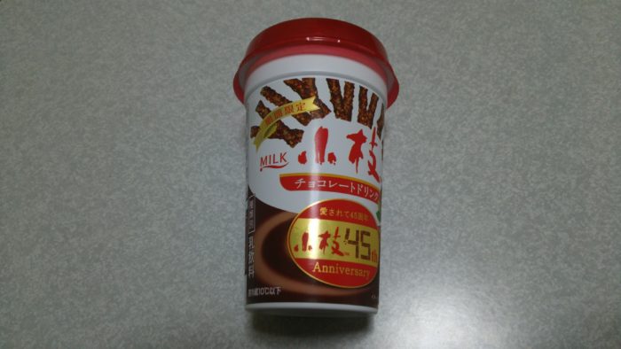 パッケージには、「1971年の発売以来45年間愛され続ける、小枝<ミルク>をドリンクにしました。アーモンド香るコクのある味わいをお楽しみください。」とあります。パッケージの下半分にも大きく「小枝45th」と記載があります。
