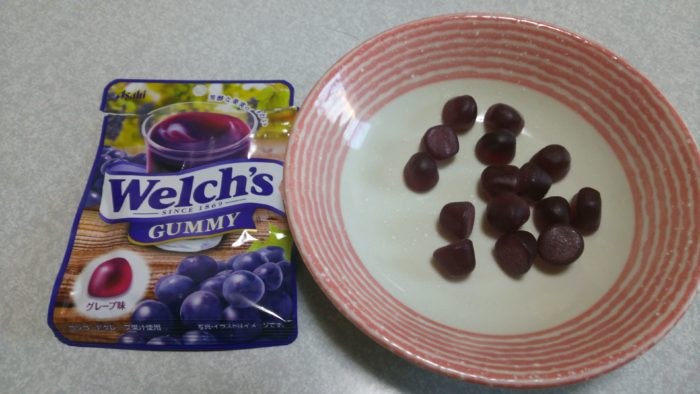 食べてみると、硬めのグミ。歯ごたえがあります。グレープの味が口に広がります。ただ一粒がちょっと小さいかな。ウェルチのジュースが飲みたくなりました。
