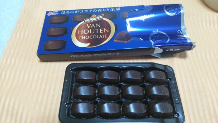通常版のバンホーテンチョコレートは、白っぽいパッケージでしたが、ビターは青い箱になっています。