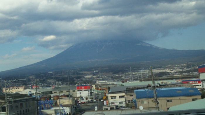 帰りの新幹線から撮った富士山。雲にすっぽり隠れています。行きは、こんなにきれいだったのに・・・。