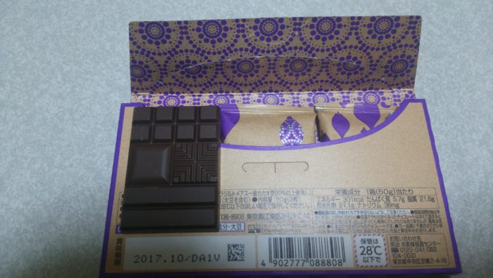 食べてみると・・。なめらかなチョコレート。カカオ分が多くなると、粉っぽくなるものですがこれはおいしいです。ミルク分も十分感じられました。