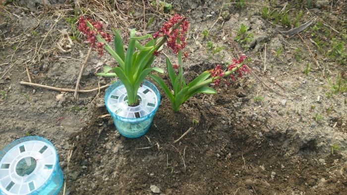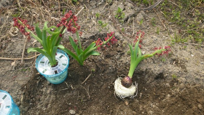 水耕栽培キットから出して、畑に植えていきます。畑の養分を吸い取って、少しでも球根が太ればいいなと思います。