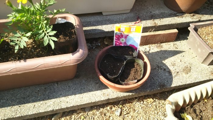 黒い苗用ポットに蒔きました。どのくらい芽が出るか楽しみです。