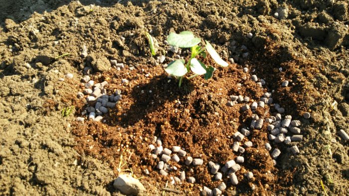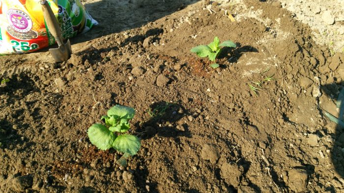 畑に、培養土を入れて植えます。