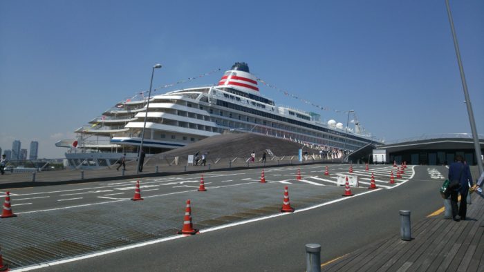 大さん橋の片側には、飛鳥Ⅱが来ていました。かなり大きいです。遠くからでも、赤のラインの入った煙突が見えます。