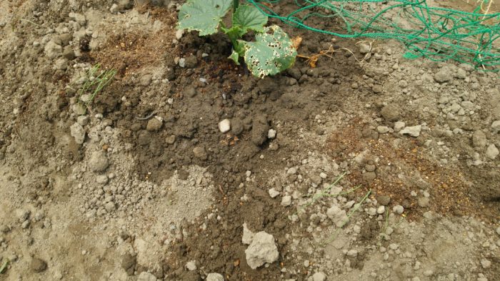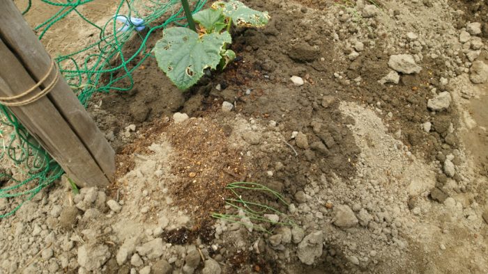 写真だとわかりにくいですが、キュウリの苗の両側にネギを植えてみました。