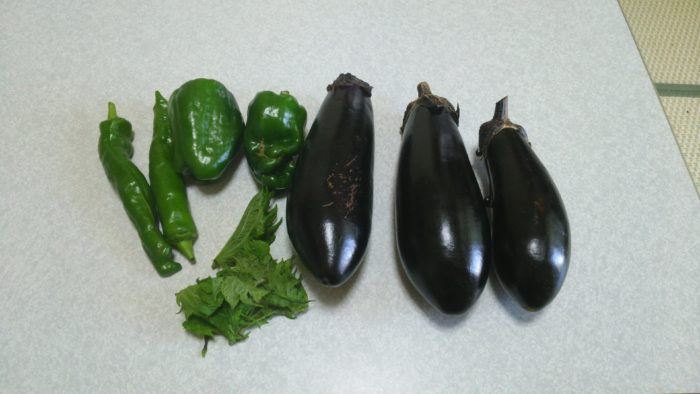ナス3つ、ピーマン2つ、唐辛子2つあとはシソの葉っぱ。