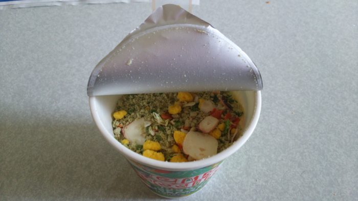 開けると、麺が緑です。加薬は、普通のシーフード味と変わらないんじゃないかなあ。