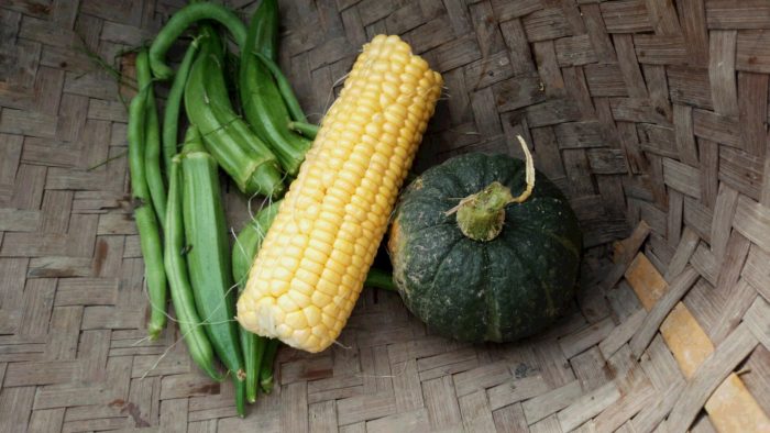今日の収穫は、カボチャ、トウモロコシ、オクラ、インゲン豆。
