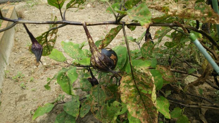 畑のナスの葉っぱが枯れてきました。だんだん今年の収穫は終わりのようです。