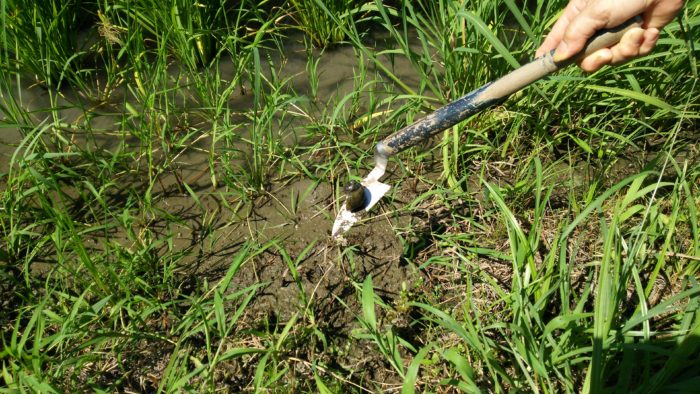隣の田んぼにいた、ジャンボタニシ。稲に赤い卵がついていて不気味です。