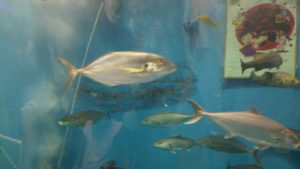 大水槽。浜名湖の魚がいっぱいです。シュモクザメも剥製が展示されていました。