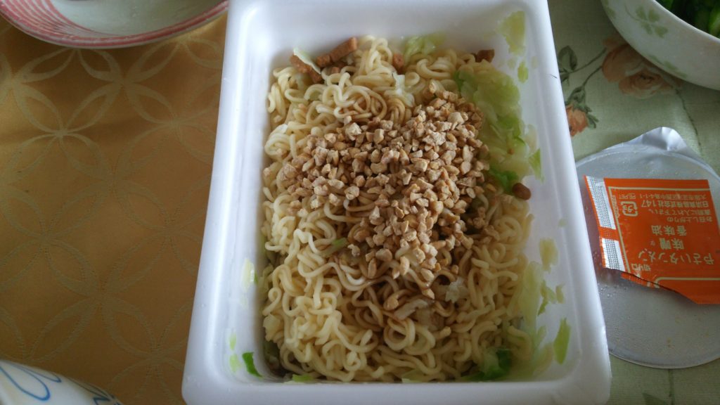 すごい納豆の香りがします。食べてみると、結構普通のペヤング。納豆が入っているので多少ぬるぬるしますが。