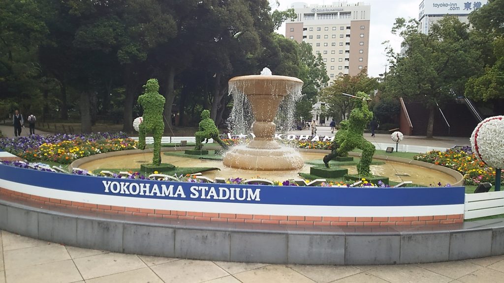 横浜スタジアム横の噴水。野球バージョンになっています。