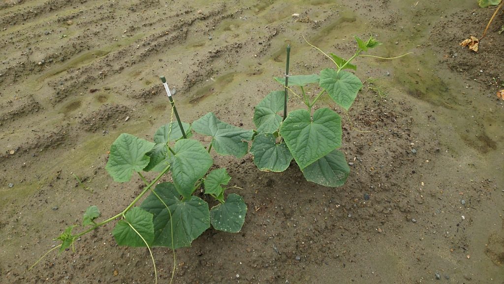 キュウリはこれからでしょうか。だんだん杭を打って、横棒を渡さないといけなくなりそうです。
