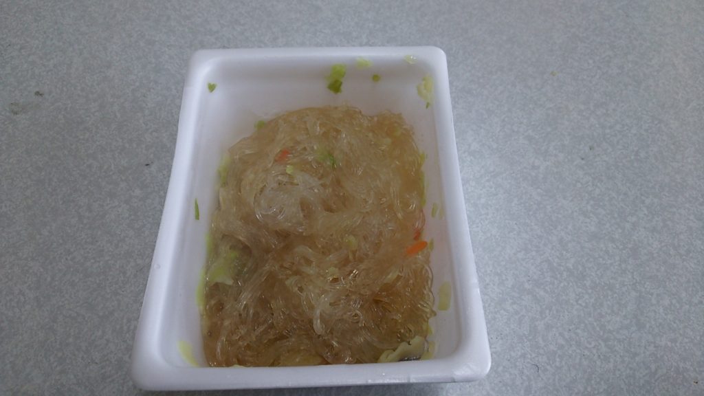 味は塩コショウ味。春雨なのでちょっとベタベタしますね。普通のペヤングとは違います。