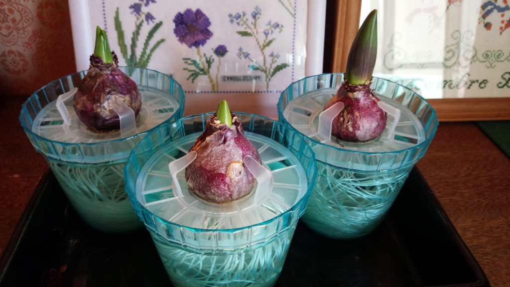 今まで冷暗所に置いていたヒヤシンスですが、芽が大きくなってきたので、暖かいところに出すこととしました。