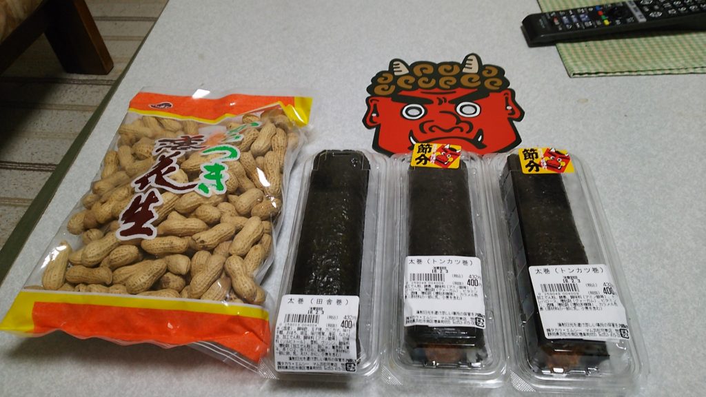 豆は、殻付き落花生。恵方巻は、田舎まき一本とカツ巻2本購入です。