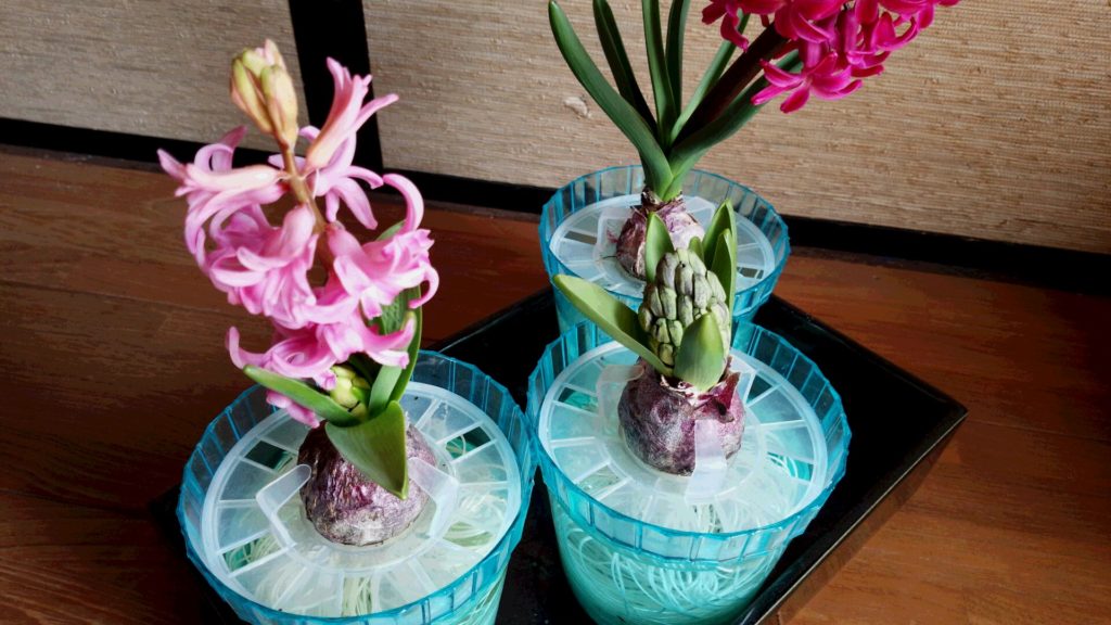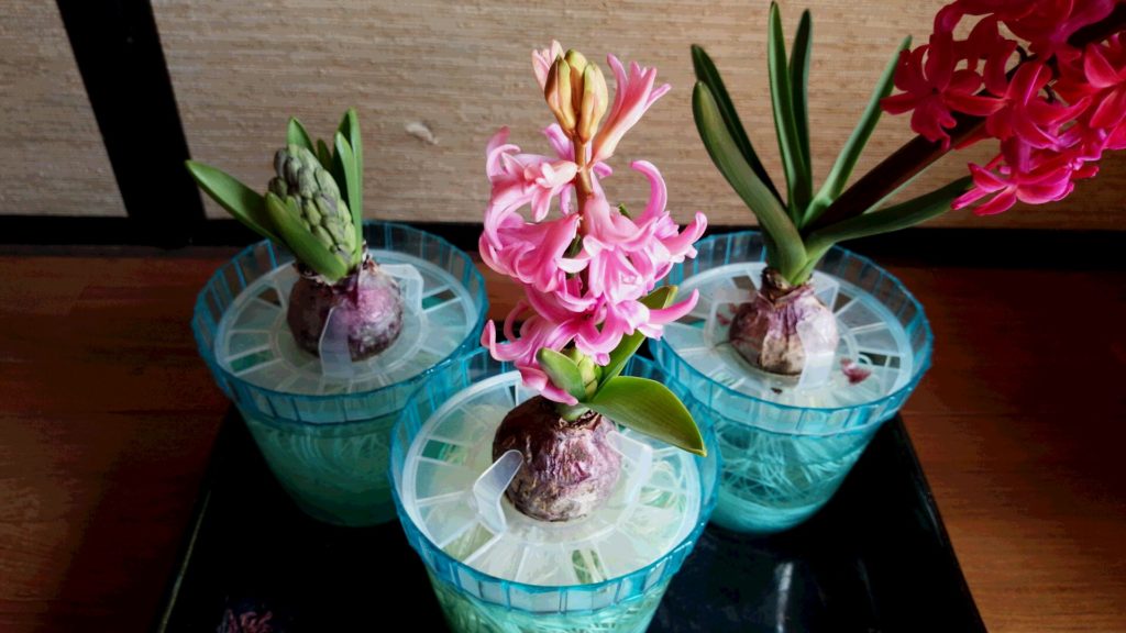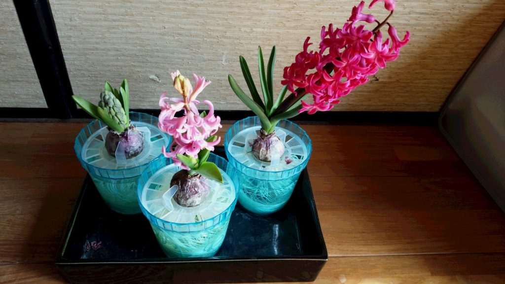 香りのよい品種のヒヤシンスなので、3つ同時に咲いたらなと思います。