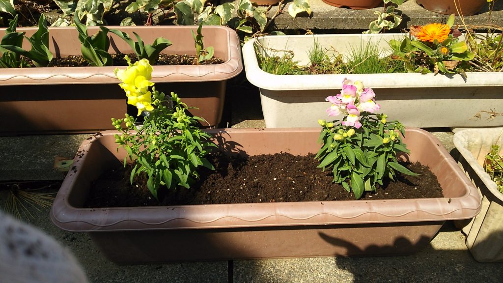 キンギョソウが売っていたので買ってきて植えることになりました。 苗の段階で、もう綺麗です。 プランターに、綺麗に植え付け完了です。