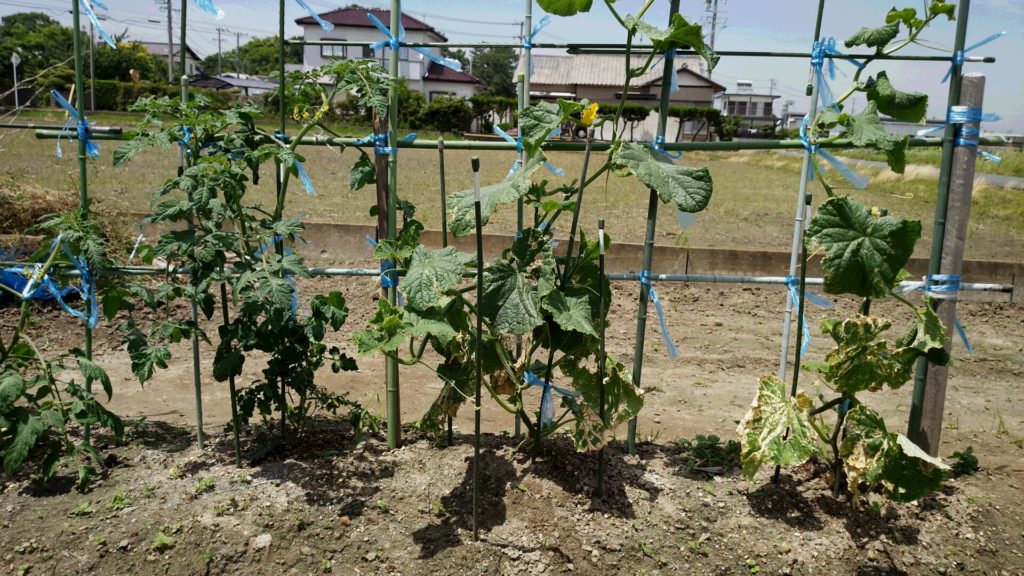 トマトと、キュウリの苗を植えて、だんだん大きくなってきました。