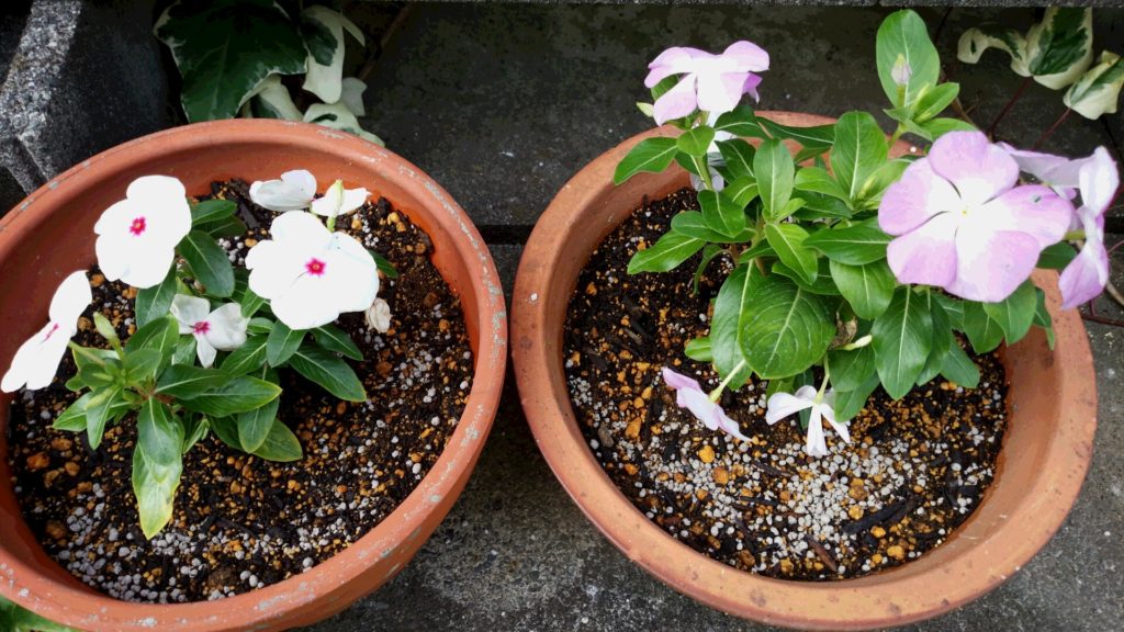 スミレの時期が終わり、花壇が寂しくなったので、日日草を植えました。