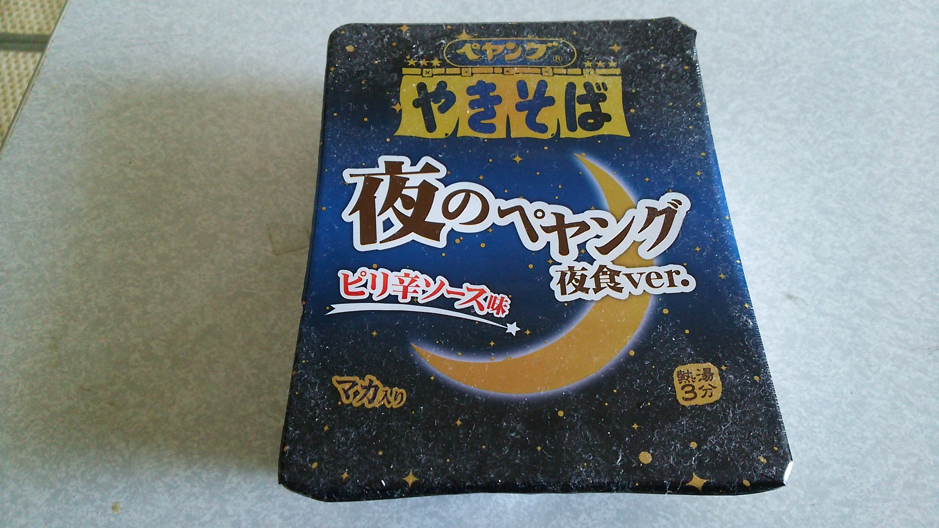 今、4倍のペヤングで攻めているまるか食品ですが、夜のペヤングというのを食べてみました。ピリ辛ソース味です。