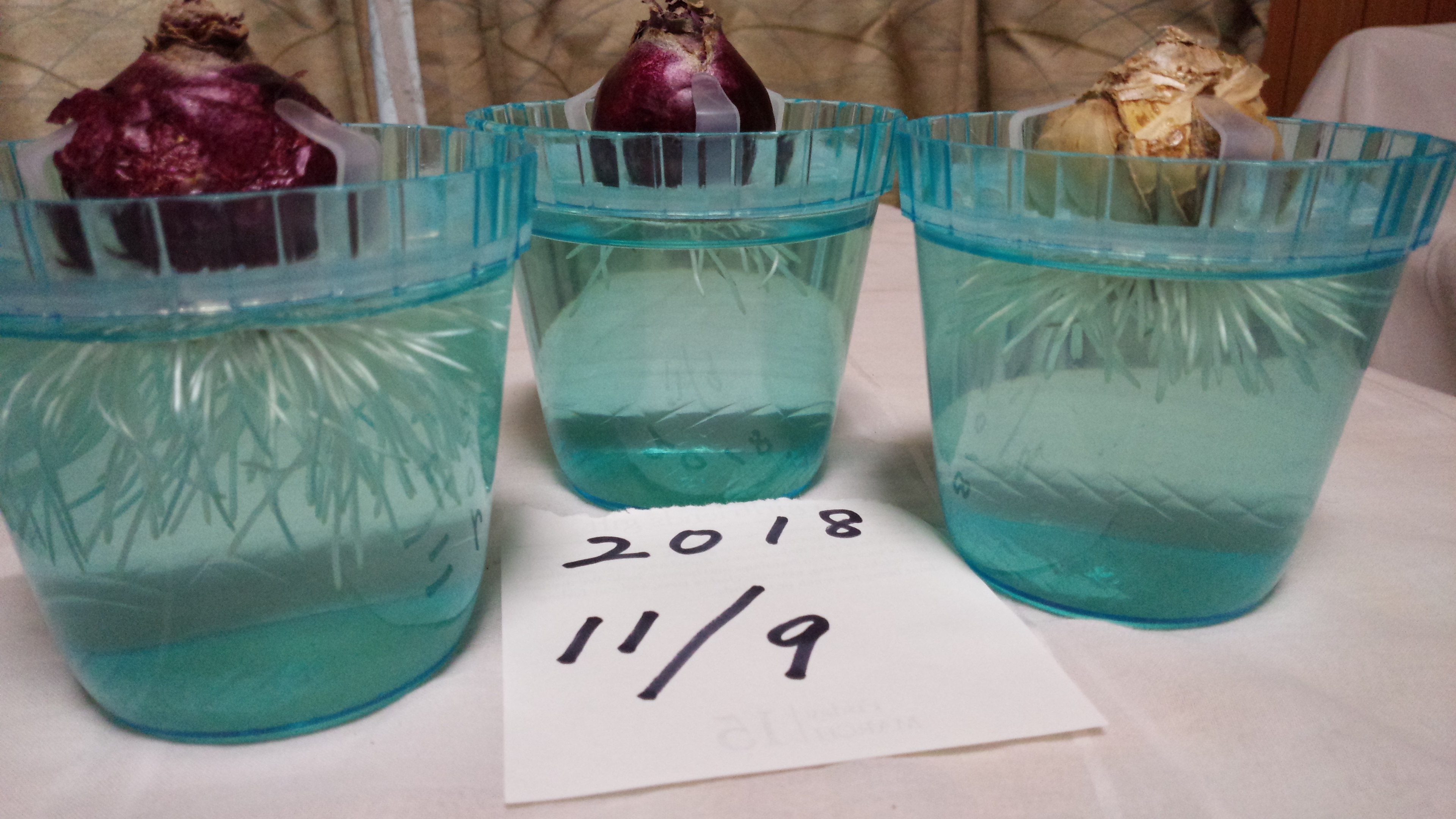 ヒヤシンスの水耕栽培を行っています。