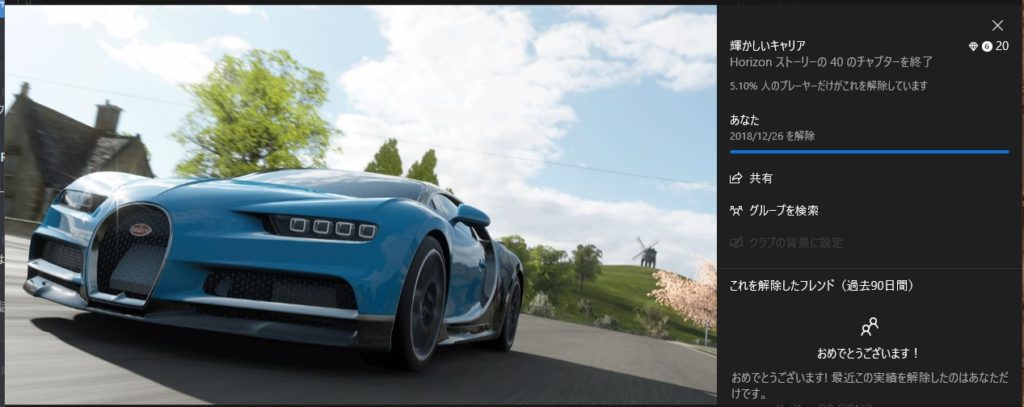 今日、ForzaHorizon4で、実績「輝かしいキャリア」を達成しました。