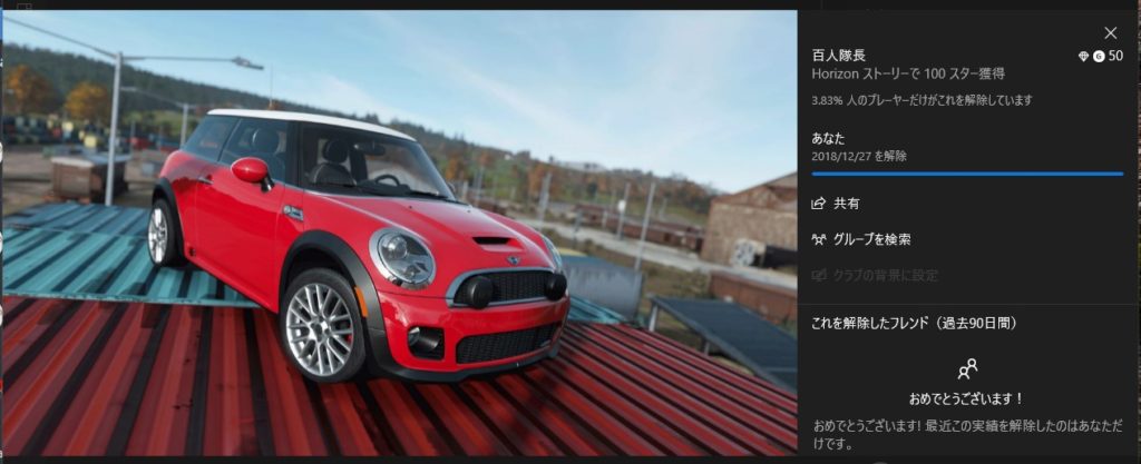 本日、ForzaHorizon4の実績「百人隊長」を獲得しました。