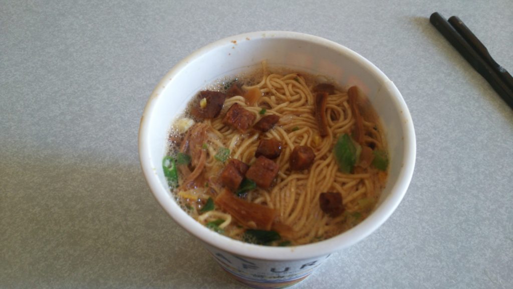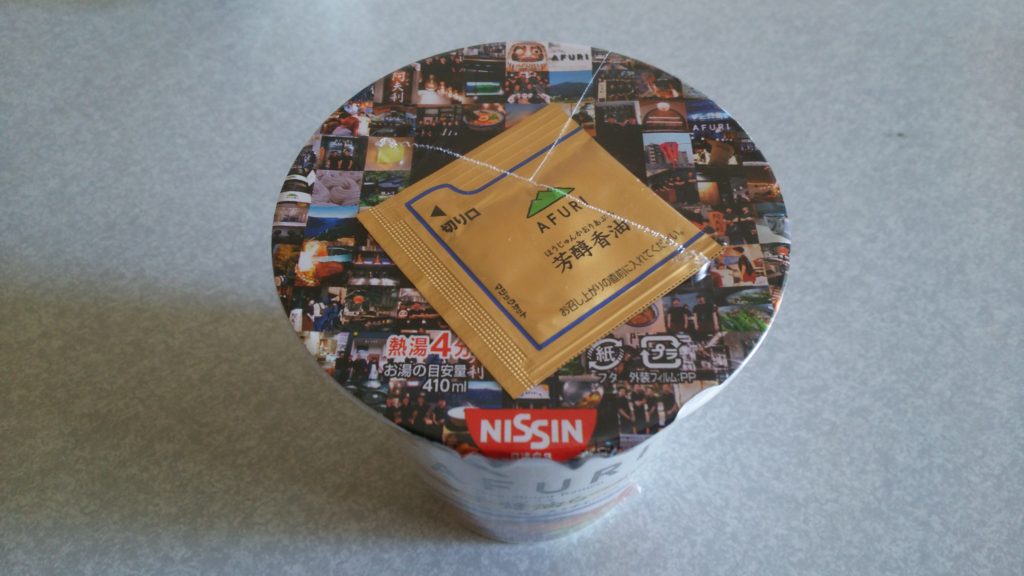 カップの上には、芳醇香油がついています。熱湯四分。全粒粉入り麺です。