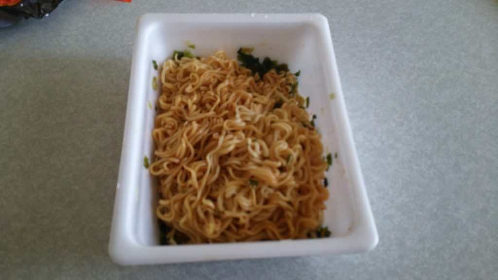 麺は、いつものペヤングです。ソースの味が甘め。味噌だからでしょうか。しかし七味は感じられませんでした。