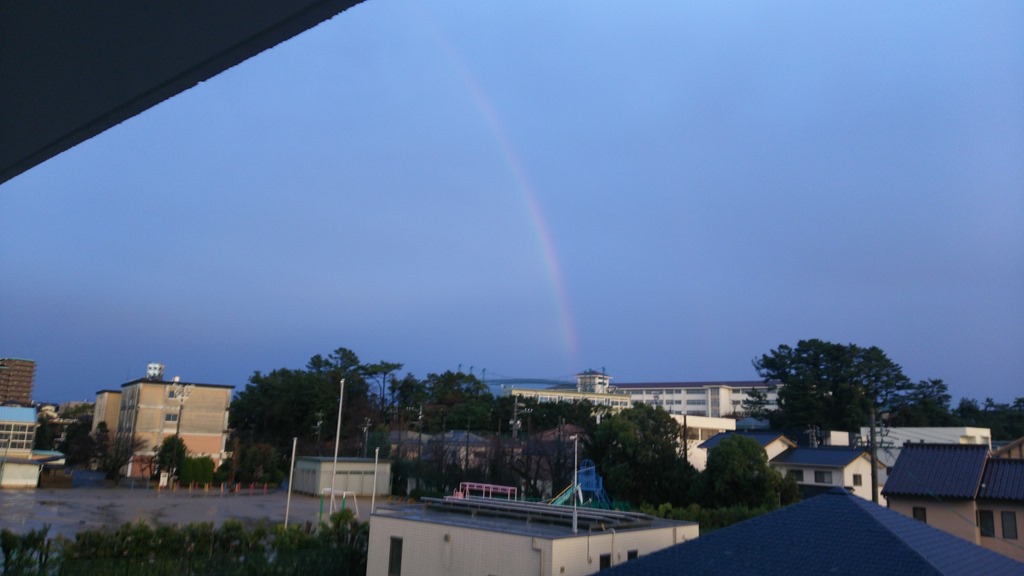 今日は、朝から大雨だったのですが、夕方には上がり、大きな虹が見えました。