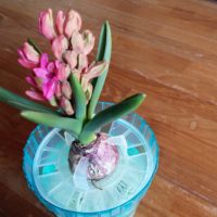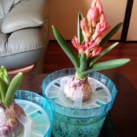 ついに、一株目のヒヤシンスが咲きました。 ピンク色のきれいな花です。 ほかの二つの株も、花芽が出ています。3株同時に咲いてくれるともっとよかったんだけど。 3株とも花の色が違うようなので、楽しみです。