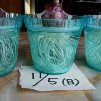 水耕栽培のヒヤシンスの根が成長しています。 3つとも成長しています。 数日でこんなに伸びるんですね。 根がもう底につきそうです。この根が容器の底でとぐろを巻く様に成長するのはいつごろでしょうか?
