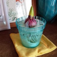 水耕栽培のヒヤシンスについに芽が出ました。 小さな芽が出ています。 3つ栽培していますが、出たのは一つ。 あとの二つは、いつ頃芽が出るでしょうか。 まだまだ、冷暗所保管は続きます。