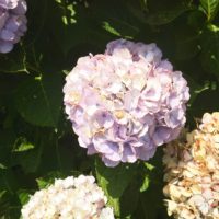 最初咲いたときは色がついていなかったアジサイですが 色がついてきました。土壌の成分によって色が変わるんでしたっけ? 紫が多く出ました。しっかし、あんまり雨降りませんねえ・・・。