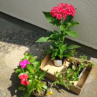 花壇の花を追加しました。 花スベリヒユと、名称不明の花。(ポットに名称が書いてなかったんですよねえ) 全部、別々の植木鉢に植えました。赤い小さな花はパニックタワーかな??