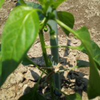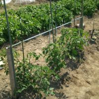 今日は、トマトの支柱をやり替えました。苗の時は小さかったのに、結構大きくなっています。 左右に杭を打って補強。 もう、青い小さな実がなっています。収穫が楽しみです。